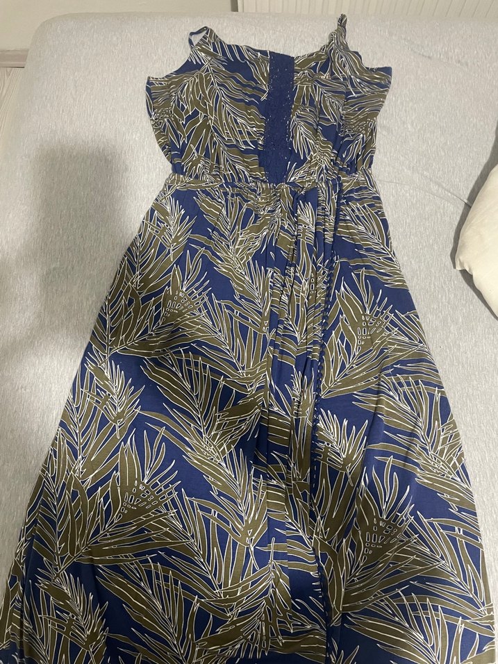 Mavi desenli,kadın tulumu, sentetik kumaştan üretilmiş, drapeli ve vücuda oturan kesime sahip, günlük kullanıma uygun bohem tarzda.