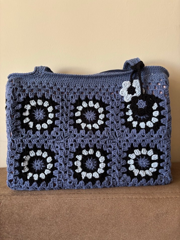 Mavi örgü malzemeden yapılmış, desenli ve dantel ayrıntılı bohem tarzda, günlük kullanıma uygun kadın çantası. Astarlı, fermuarlı, el emeği, mavi siyah, kullanışlı ve rahat omuz çantası. Boyutları; en 31cm, boy 10cm ve yükseklik 23 cm.