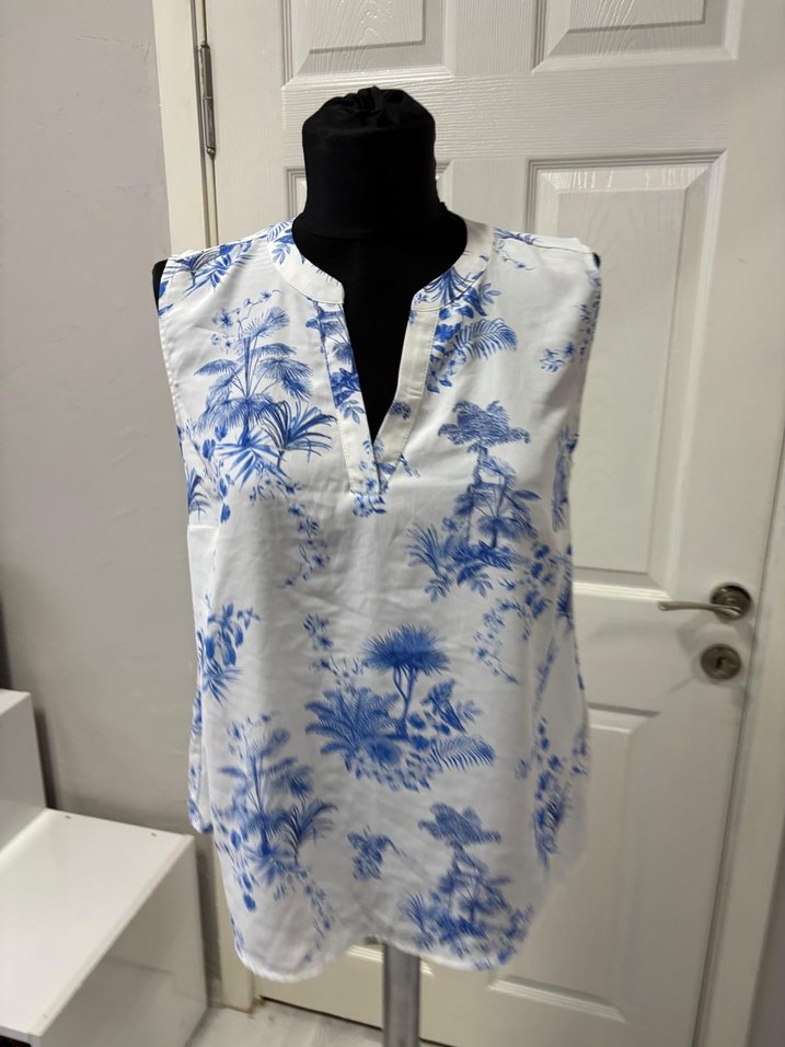 Mavi desenli, V yaka ve düğmeli, pamuklu, kolsuz beyaz bluz. Rahat ve bol kesim midi boyda, günlük kullanım için uygun.