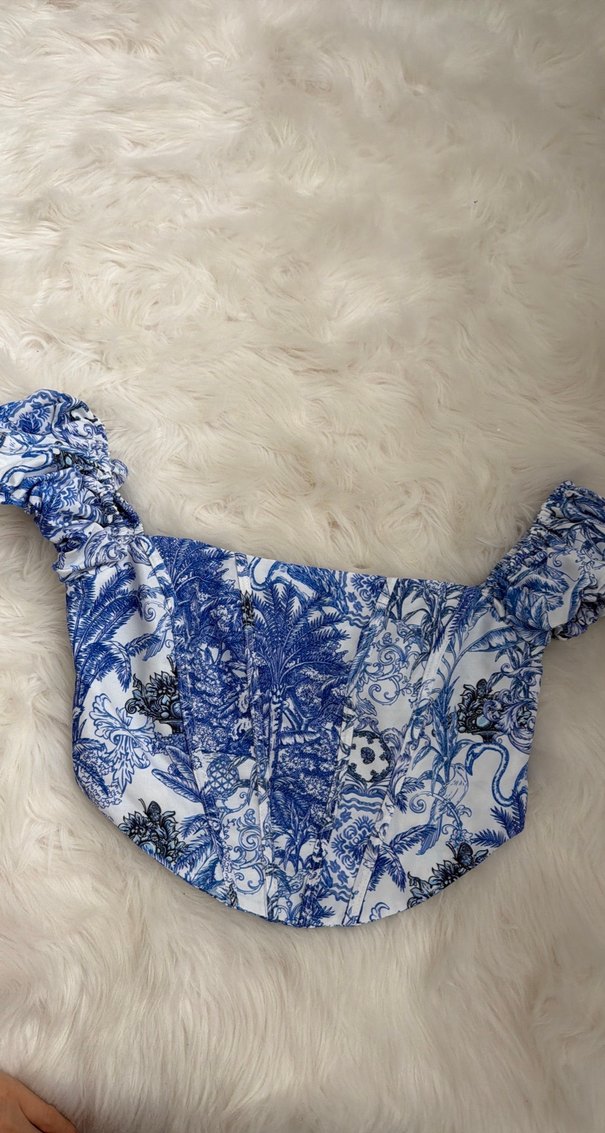 Mavi desenli, bohem tarzda, kürklü detaylı, kısa ve straplez bustiyer, dış mekan kullanımı için uygun.