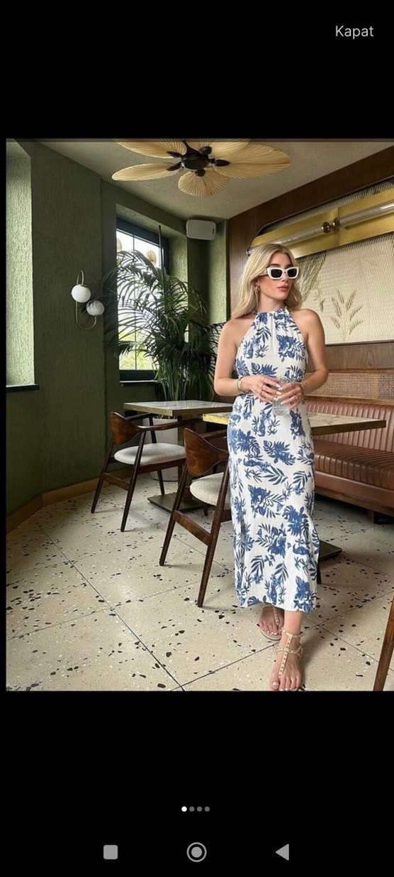 Mavi tonlarında, askılı ve straplez uzun elbise. Bohem tarzda batik desenli ve drapeli, rahat kalıplı bir model.
