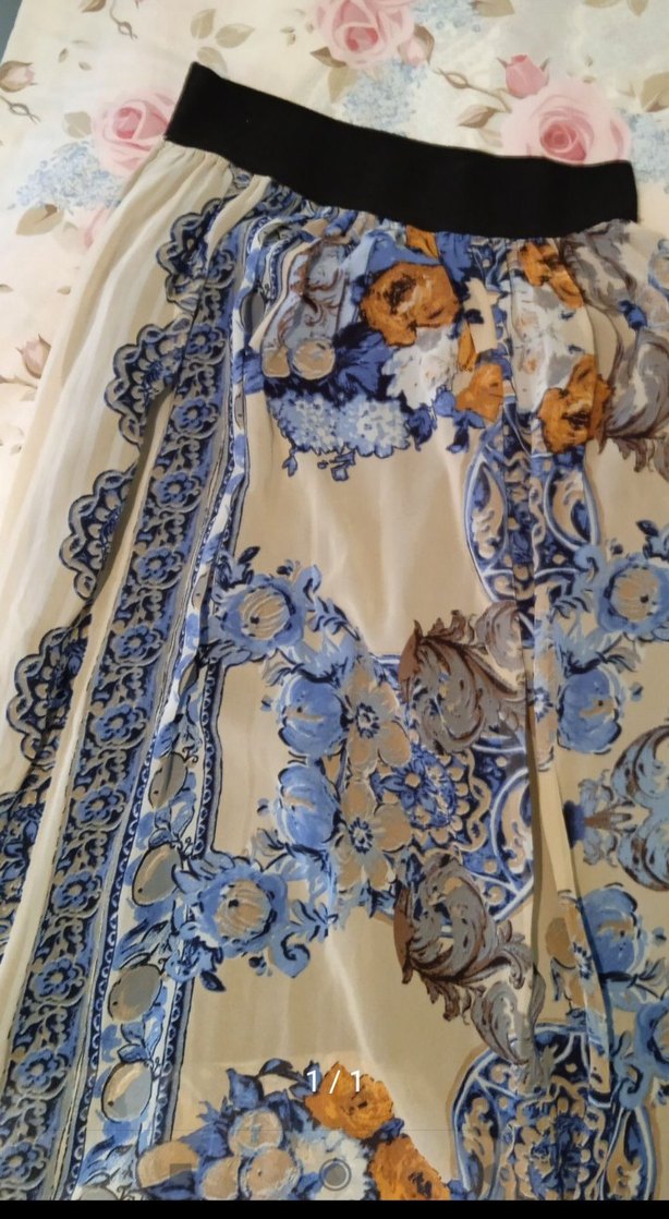 Mavi desenli, bol kesim ve drapeli uzun etek. Bohem ve retro tarzlara uygun, düğünler için ideal.