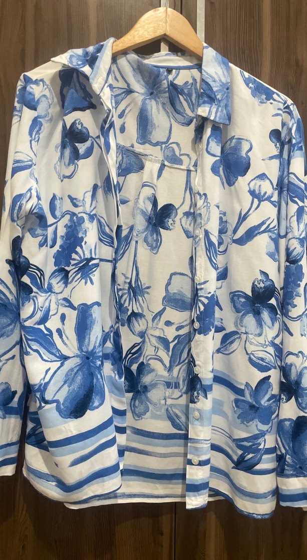 Mavi çiçek desenli, bol kesim ve normal uzunlukta, tekne yakalı, düğmeli bohem tarzda gömlek. Kalıbı geniş 38 ama 40 42 gibi