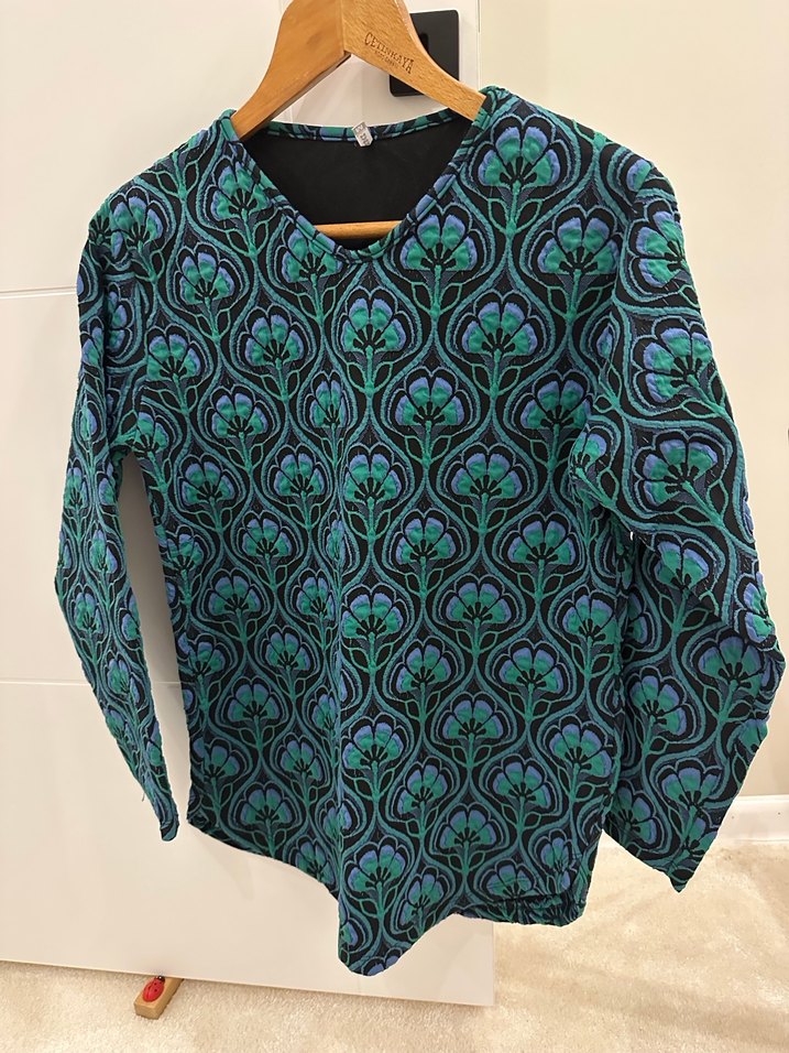 Kabartma desenli kalçayı biraz örter Uzun kollu, V yaka ve düğmeli mavi desenli tunik. Bol kesim ve midi boyda, bohem tarzını yansıtır. Günlük kullanım için uygundur.