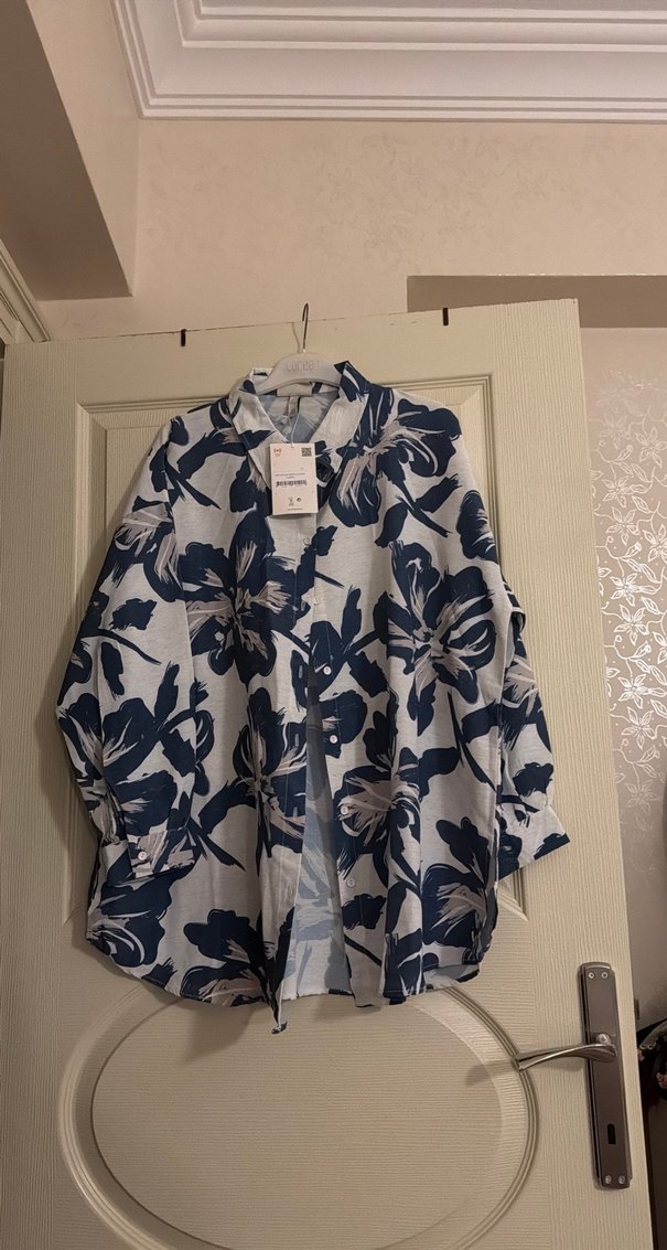 Mavi Desenli Bol Kesim Keten Gömlek/Keten Pantolon