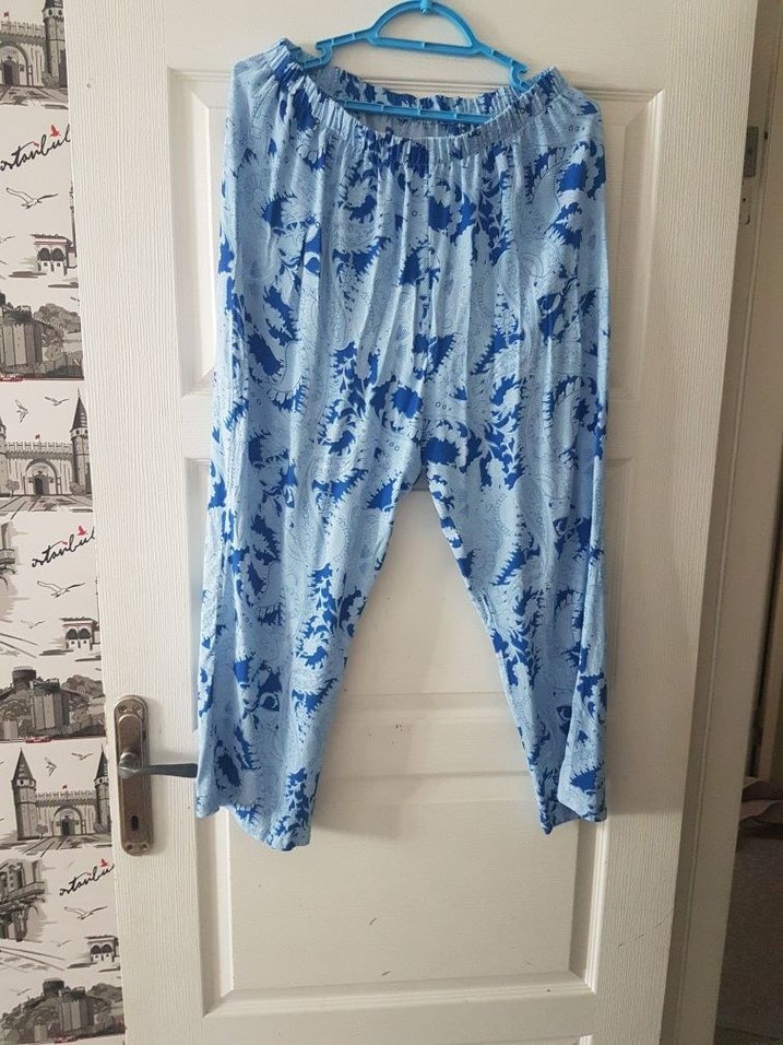 Mavi renk, desenli, bol kesim ve pileli detaylara sahip midi pantolon. Yumuşak kumaştan üretilmiştir. Bohem tarzı için uygundur. 42_44_46 neden uyumlu.ag kisminida eklesim.hasar lele yok.yeni