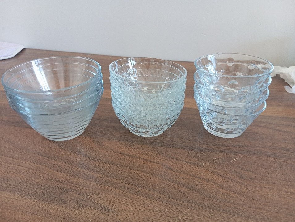 Desenli ve kabartmalı desenlere sahip açık mavi cam kaselerden oluşan set. Servis veya dekorasyon için uygundur. ️Takım değildir en küçük kasede iki tanede deforme var başka bişeyi yok