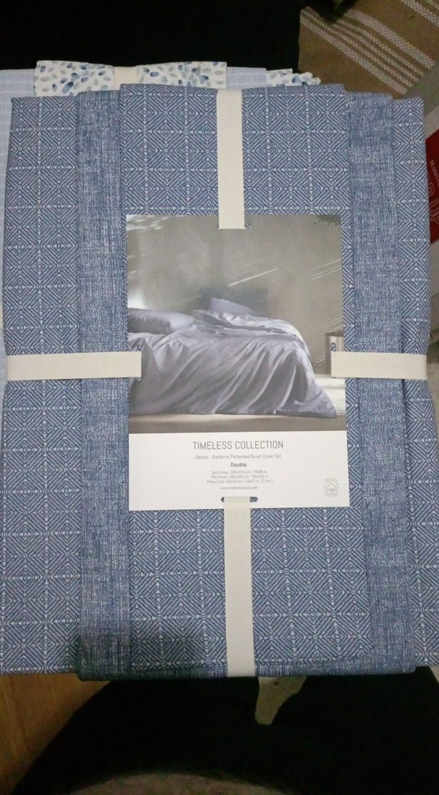 Mavi ve gri tonlarda geometrik desenli çift kişilik nevresim takımı, Timeless Collection'dan. Yumuşak ve konforlu kumaş sunar. ️