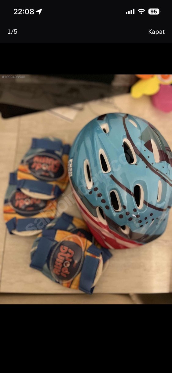 Renkli mavi çocuk koruyucu setinde plastik kask ve cırt cırtlı kayışlı uyumlu pedler bulunur. Kask çoklu havalandırma deliklerine ve baskılı desene sahiptir. ️