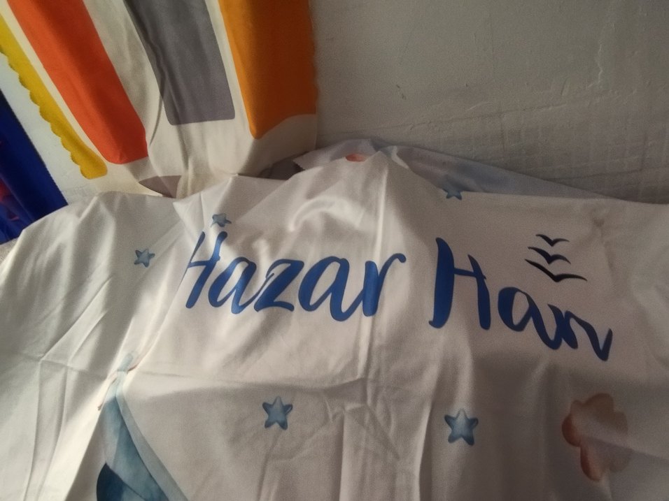 Pastel mavi renkte, 'Hazar' yazılı ve küçük yıldız desenli, yumuşak sentetik kumaştan çocuk büyük fon perde ölçüsü 1.30 *260Üzerinde isim yazılı olduğu için uygun fiyatlı