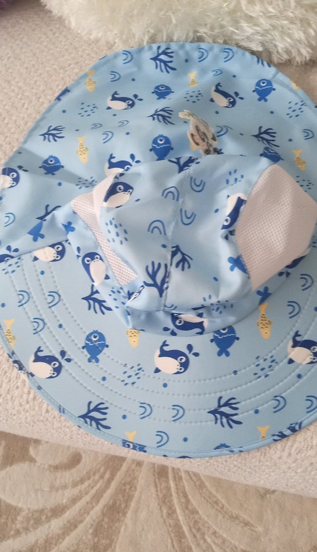 Pastel mavi renkli çocuk plaj şapkası, balık ve deniz bitkisi desenleriyle süslenmiştir. Hafif yapısı ile güneşten koruma sağlar.
