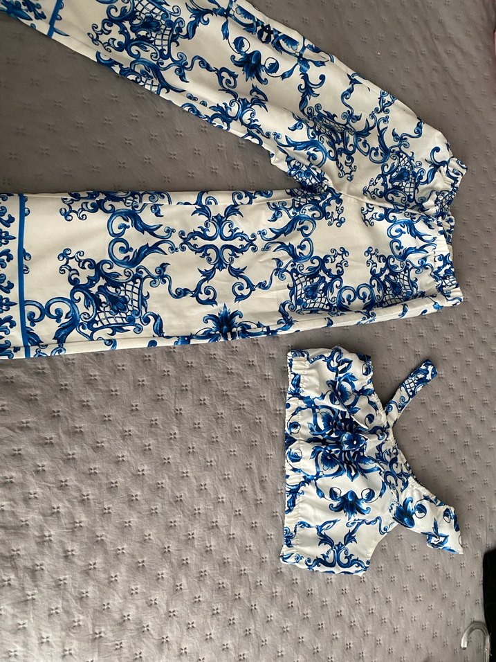 Mavi desenli, dantel detaylı, bohem tarzda, uzun kesim ve vücuda oturan kadın pantolonu. Günlük kullanıma uygundur.