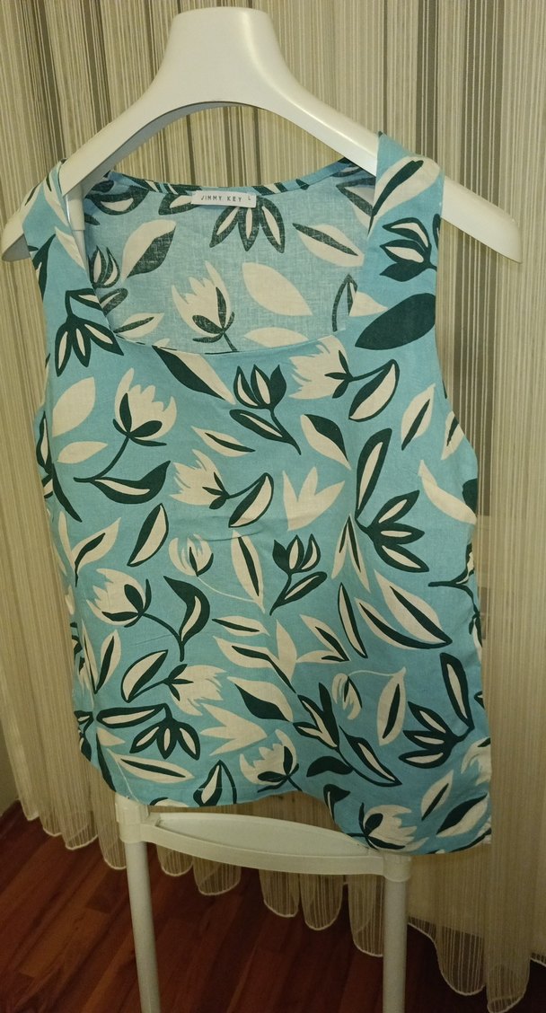 Mavi çiçek desenli, askısız yakalı, drapeli ve salaş kesim, kolsuz bluz.