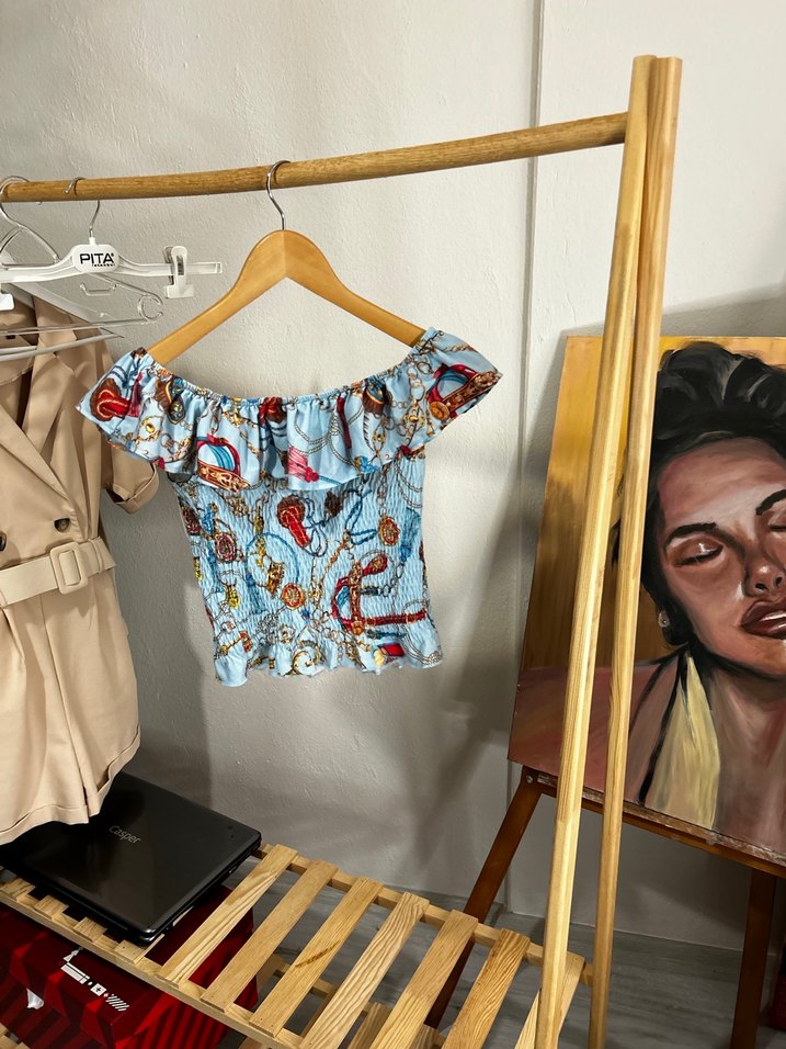 Mavi renkli, kısa kollu, straplez ve bol kesim bluz. Drapeli tasarımı ve baskılı dokusu ile bohem tarzına uygun.
