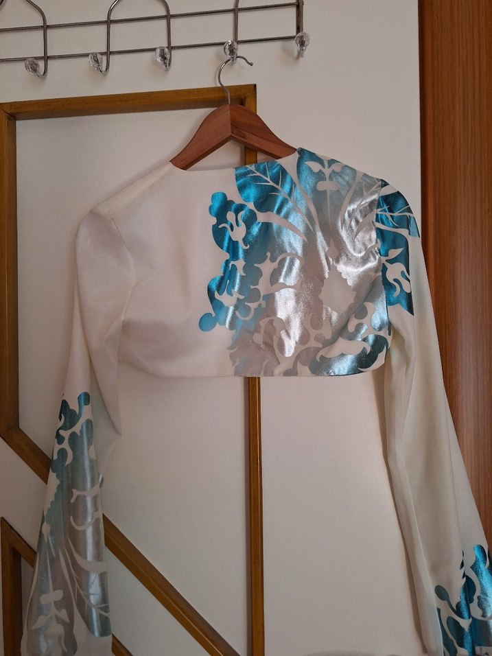 Uzun kollu desenli bolero,ipeksi kumaştan olup mavi desenlerle drapeli detaylar sunar. Düğünler için uygundur. Elbise üstüne rahatlıkla.kullaniirsiniz. beden 36-38 e uygun sanırım.