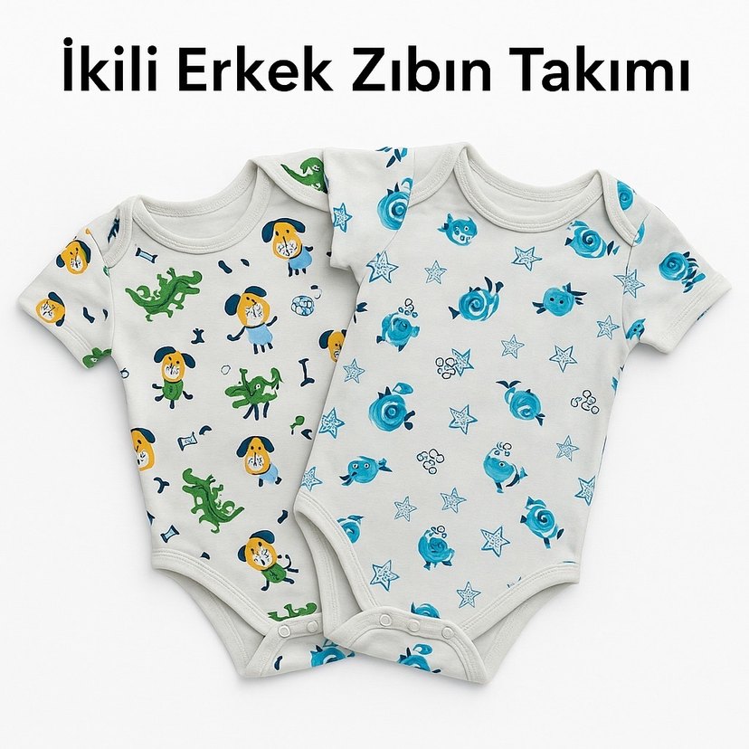 Mavi ve renkli desenlere sahip, kısa kollu, yuvarlak yakalı, yumuşak sentetik kumaştan üretilmiş iki adet erkek bebek zıbını.