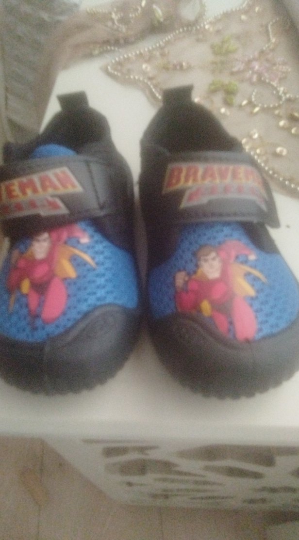 Mavi renkli, renkli baskılı ve Velcro kapamalı kauçuk erkek çocuk botları. Süper kahraman desenli ve 'MA' detaylıdır.