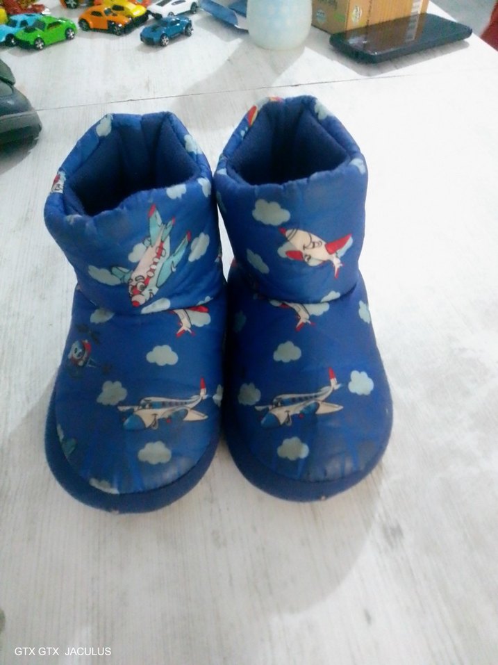 Mavi tabanlı, renkli uçak desenli ve yumuşak kauçuk tabanlı erkek çocuk ev terliği. ✈️
