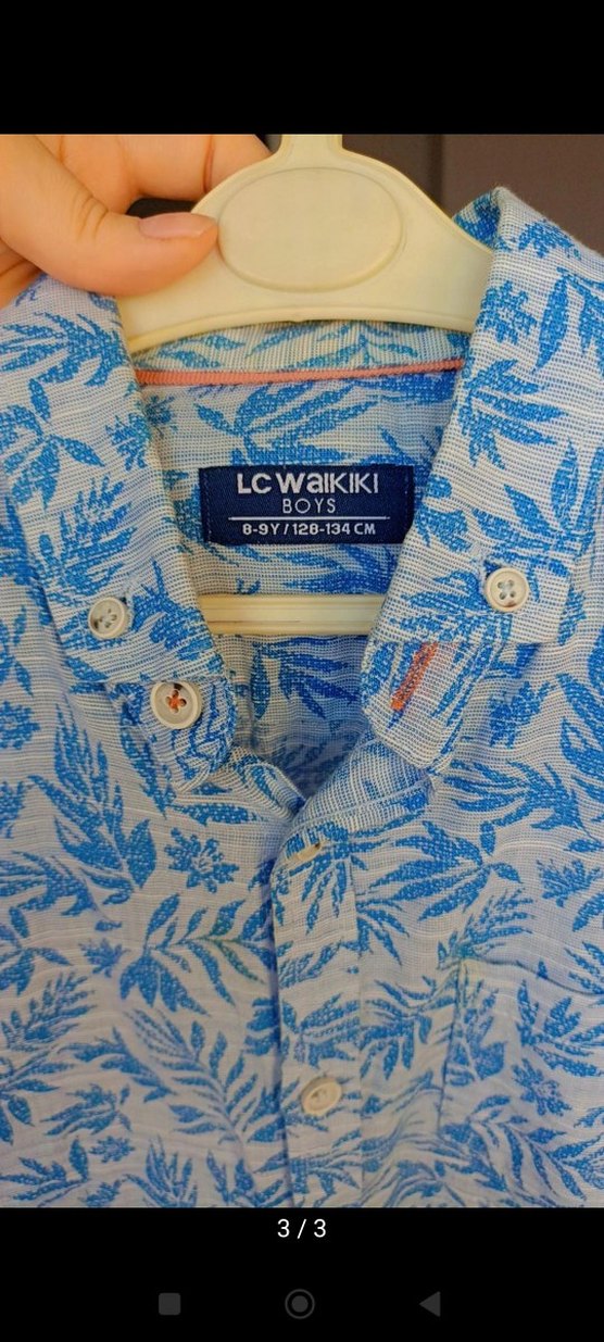 LC Waikiki markalı, se mavi yaprak desenli, düğmeli, erkek çocuk gömleği.