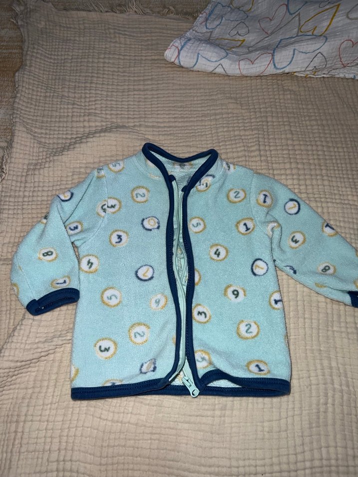 Erkek çocuklar için bol kesim, yuvarlak yakalı ve düğmeli polar ceket. Pastel mavi renkte, sayılı baskılı, rahat sokak stili için uygundur.