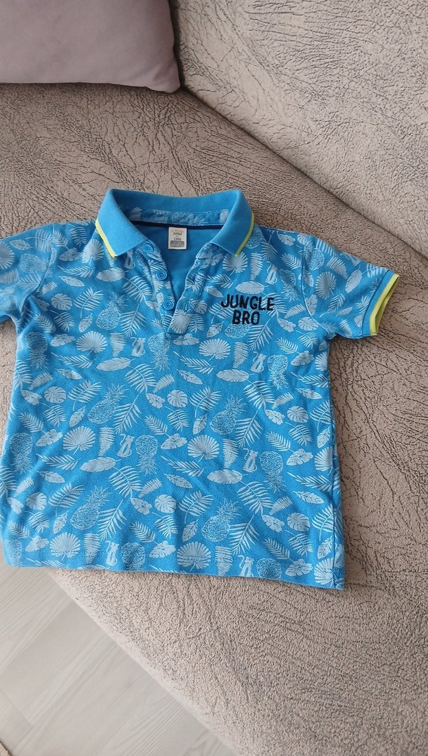 Mavi kısa kollu, renkli desenli ve düğmeli yakalı erkek çocuk polo tişört. bır ıkı kez gıyıldı