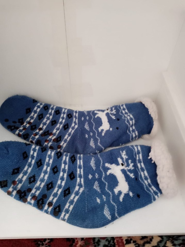 Mavi renkli, beyaz geyik desenli ve içi yumuşak astarlı renkli erkek çorapları.