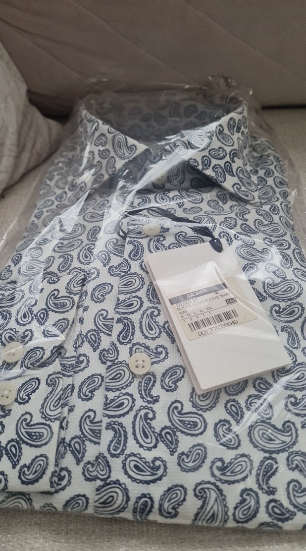 Mavi paisley desenli, klasik yakalı ve beyaz düğmeli erkek gömleği, yumuşak kumaştan, plastik ambalajda.