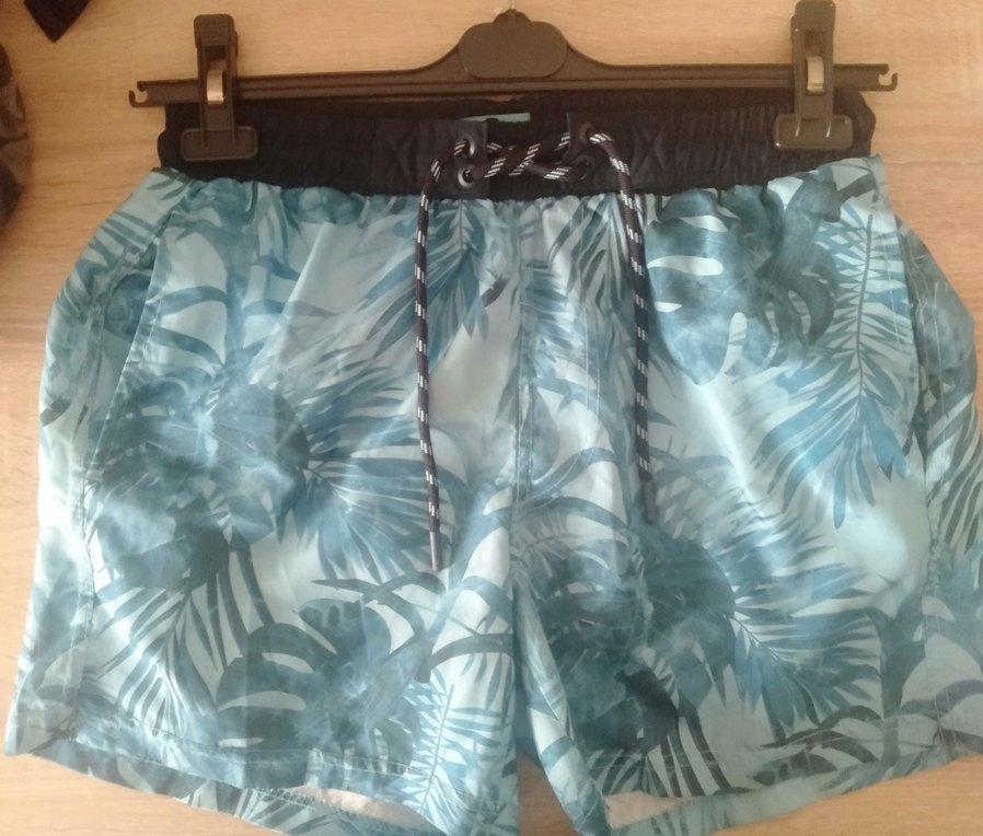 Mavi desenli, kemerli, bol kesim erkek kısa deniz şortu, plajda rahat kullanım için bohem tarzda.Yanlarda ve arkasında cep var xs beden