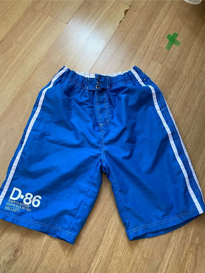 Mavi renkli, yanlarında beyaz şeritler ve renkli baskılar bulunan erkek şortu. Bel kısmı lastikli ve düğmeli, üzerinde 'D-86' baskısı yer alır.