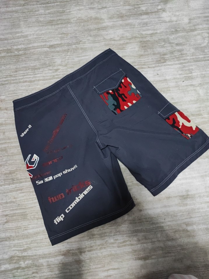 Sentetik kumaştan, koyu mavi renkli, baskılı detaylı ve cırt cırtlı ceplere sahip, erkek yüzme şortu.