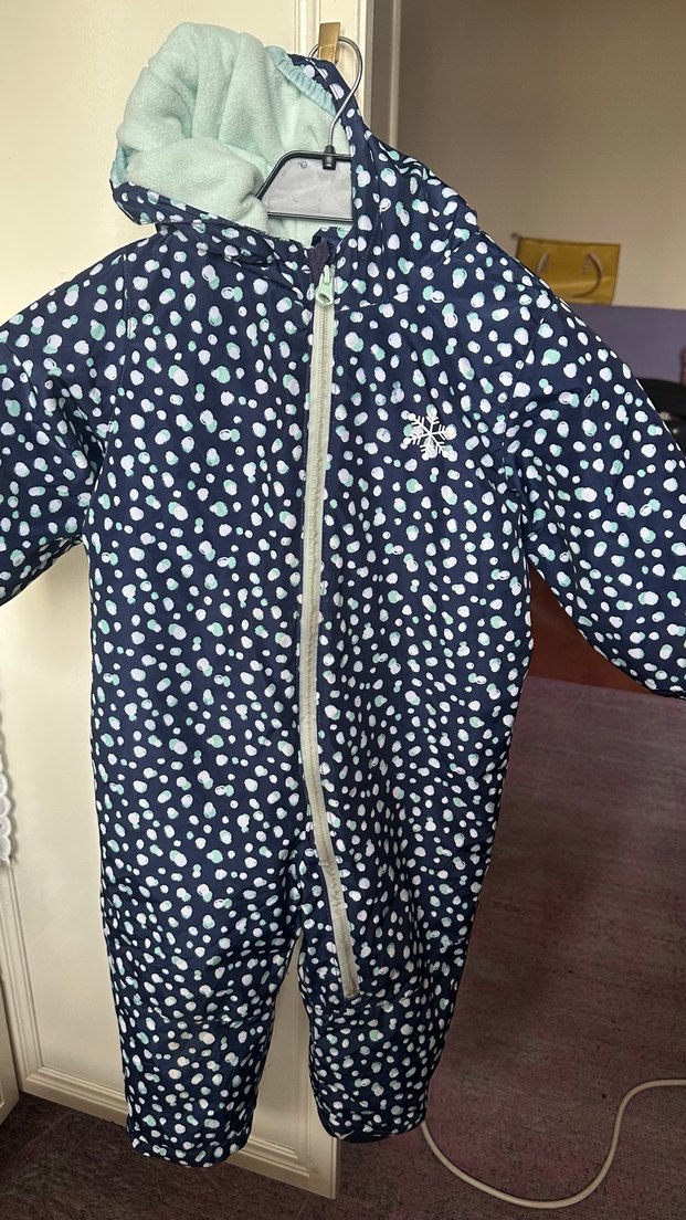 Koyu mavi, desenli ve fermuarlı bebek kayak tulumu. İç kısmı yumuşak ve sıcak tutan polar kumaşlıdır. ❄️