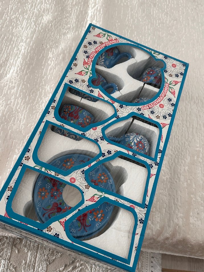 Çiçek desenli, mavi renkli fincan ve tabağı içeren fincan seti, dekoratif kutuda sunulmuştur.