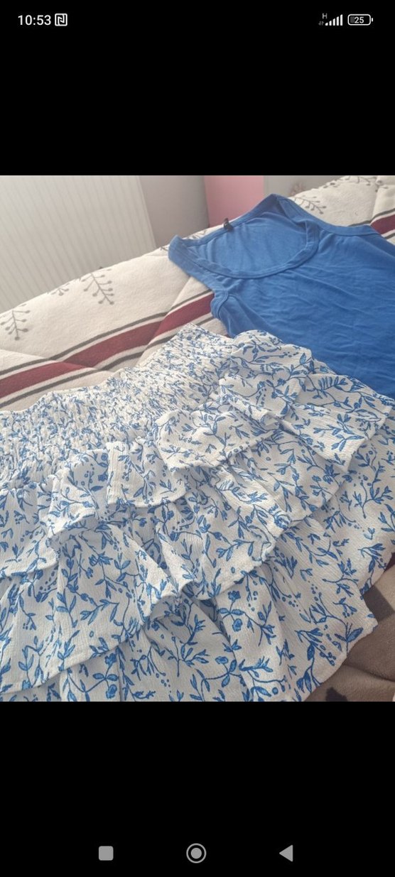 Yumuşak dokulu, mavi desenli, bol kesim minii etek ve tişort Fırfır detaylarıyla günlük kullanıma uygun bohem tarzda. hiç giyilmedi fotoğrafta soluk çıkmış renkler canlidir
