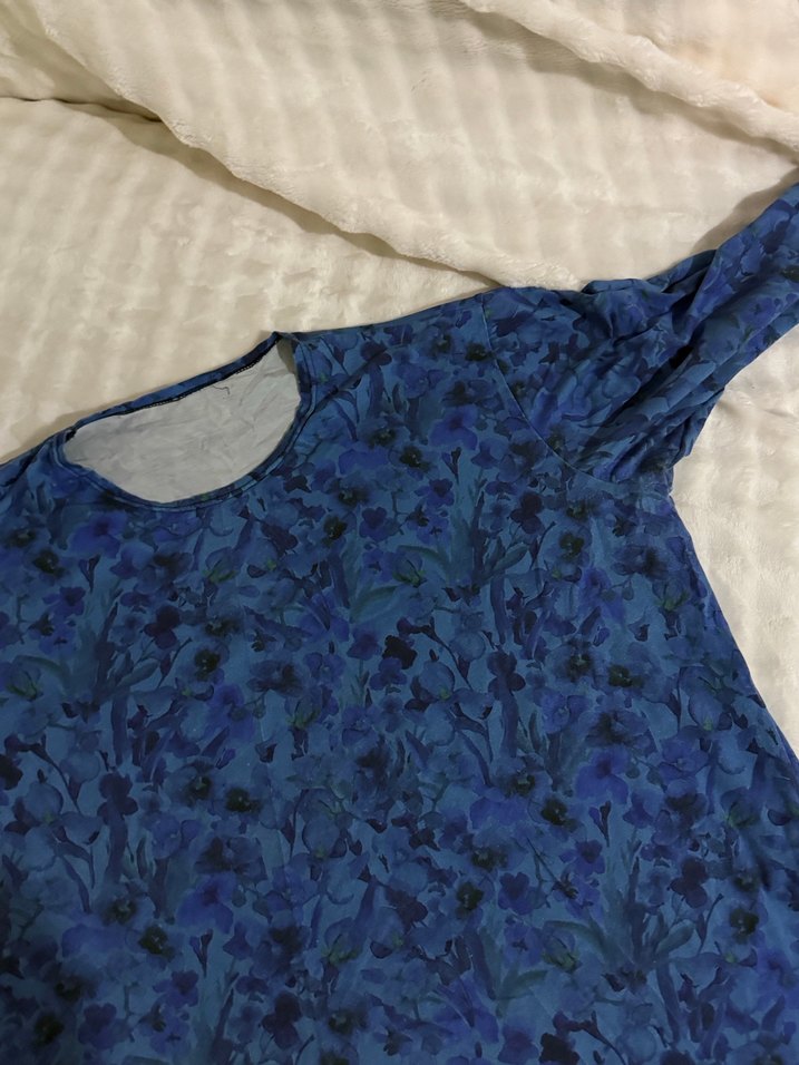 Mavi çiçek desenli, kısa kollu, yuvarlak yakalı, bol kesim hamile tişörtü. Yumuşak sentetik kumaştan, günlük kullanıma uygun.