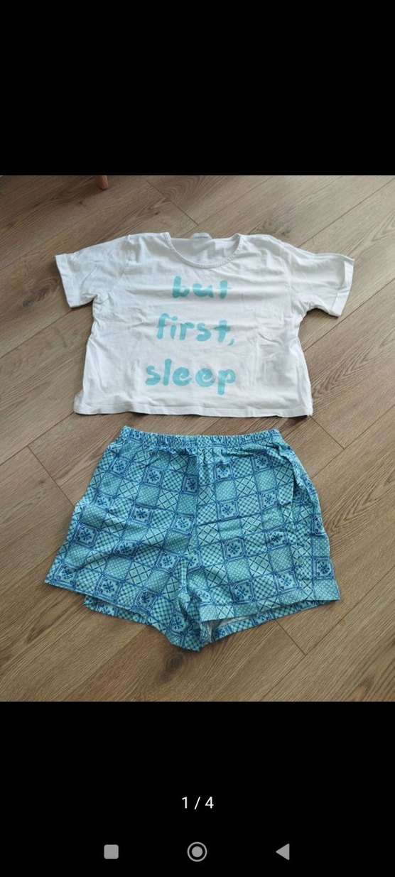 Kısa kollu, yuvarlak yakalı, bol kesim 11-12 yaş pijama takımı. Üst beyaz, mavi pastel baskılı "but first, sleep" yazılı, alt mavi desenli şortlu.