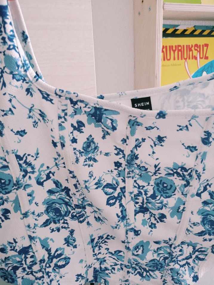 Mavi pastel çiçek desenli, normal uzunlukta ve midi boyda, vücuda oturan hemşire korsesi. Rahat kullanım için yumuşak kumaşlı.