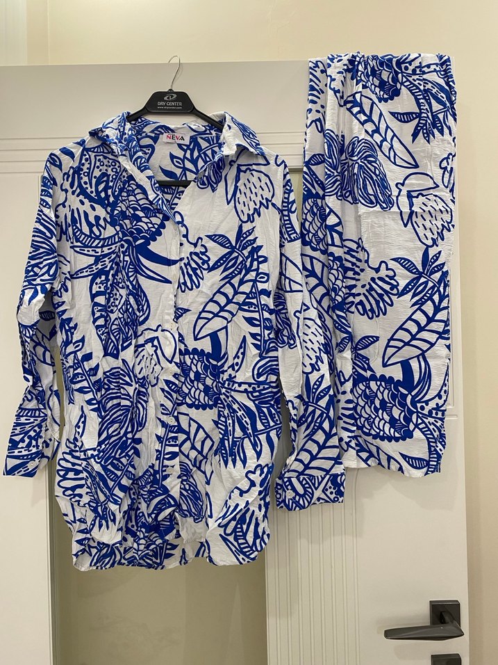 Mavi desenli keten kumaştan, V yaka ve düğmeli uzun kollu kadın gömleği ve pantolonu . Rahat kesim ve uzun boy, günlük kullanım için bohem tarzda uygun.