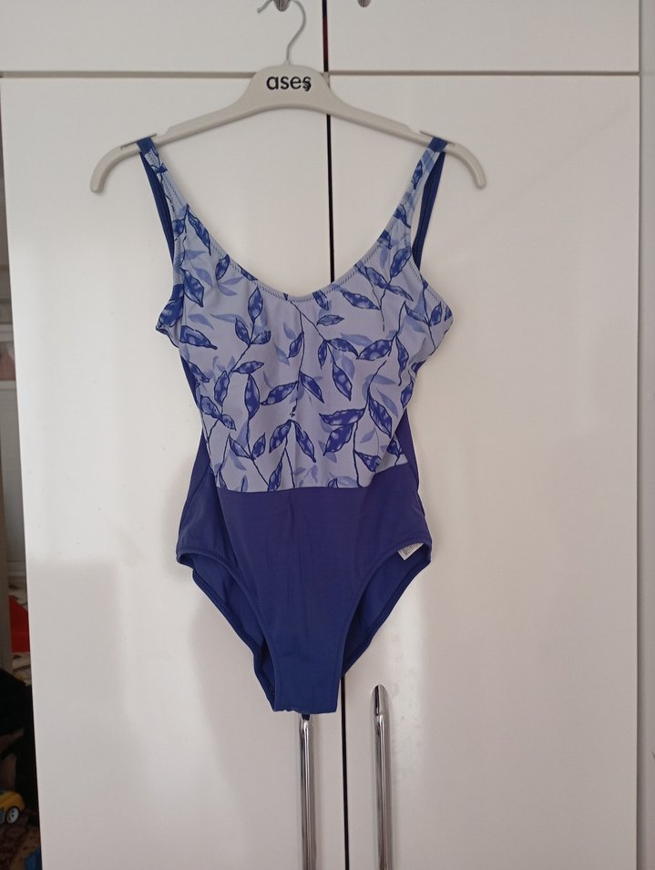 Mavi yaprak desenli, ince askılı, vücuda oturan kadın mayo kusuru yoktur
