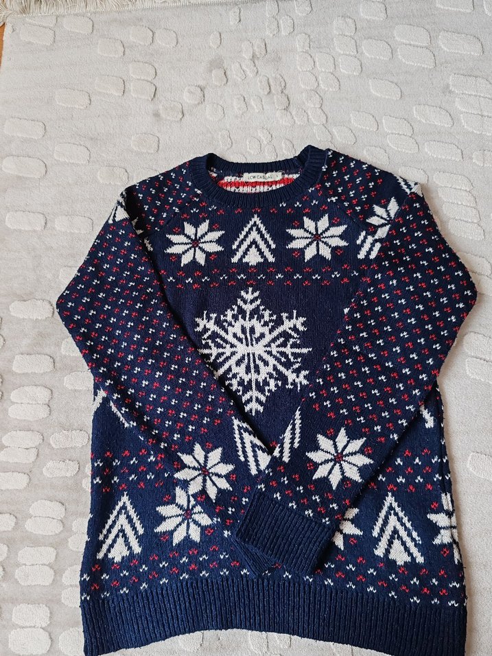 Uzun kollu, yuvarlak yakalı, mavi kar tanesi desenli örgü kadın kazak. Rahat kesim ve normal boyda, sıcak tutan günlük kullanıma uygun. ❄️