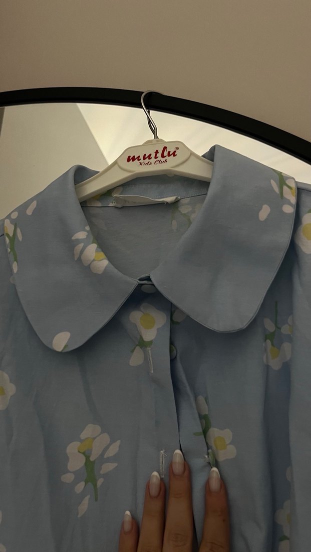 Düğmeli, keten kumaştan, mavi pastel desenli, kısa kollu ve yakalı bol kesim gömlek. Rahat ve şık bir günlük tercih.
