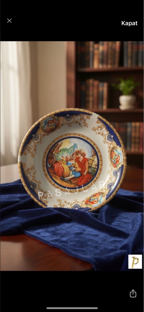 Koyu mavi renkte, klasik tarzda, merkezi eski tarz bir resim ve detaylı desenlere sahip tabak. ️