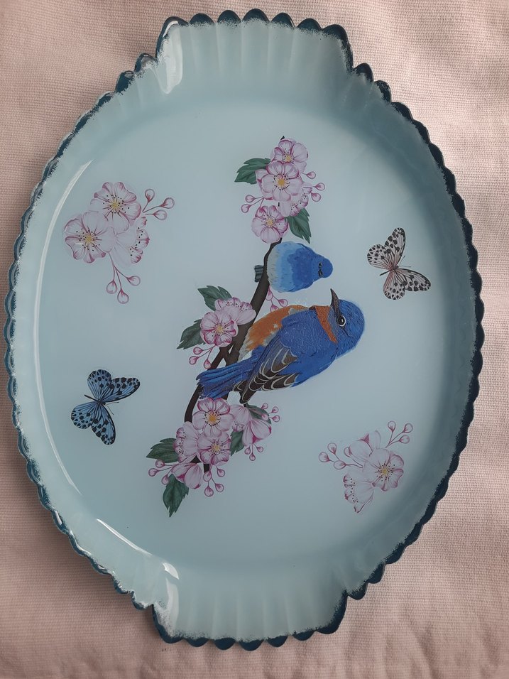 Pastel mavi renkte, kuş, kelebek ve çiçek desenleri bulunan klasik tarzda tabak. Kenarları dalgalı ve koyu mavi renkte. cam tepsi paşabahçenin olup 24'34 boyutta buyuk tepsidir. akrilik boyama tepsinin altindadir. sudan uzak tutulmalı,