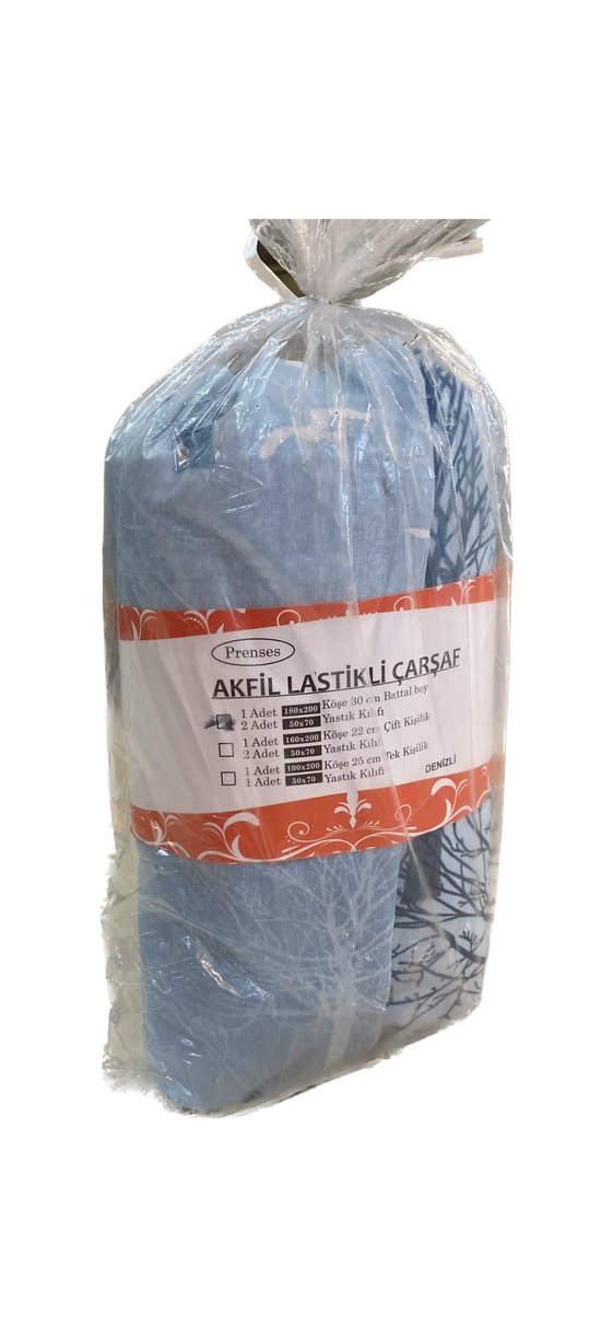 Prenses marka, mavi ve gri tonlarda desenli lastikli çarşaf, kenarları elastik olup sağlam oturur.