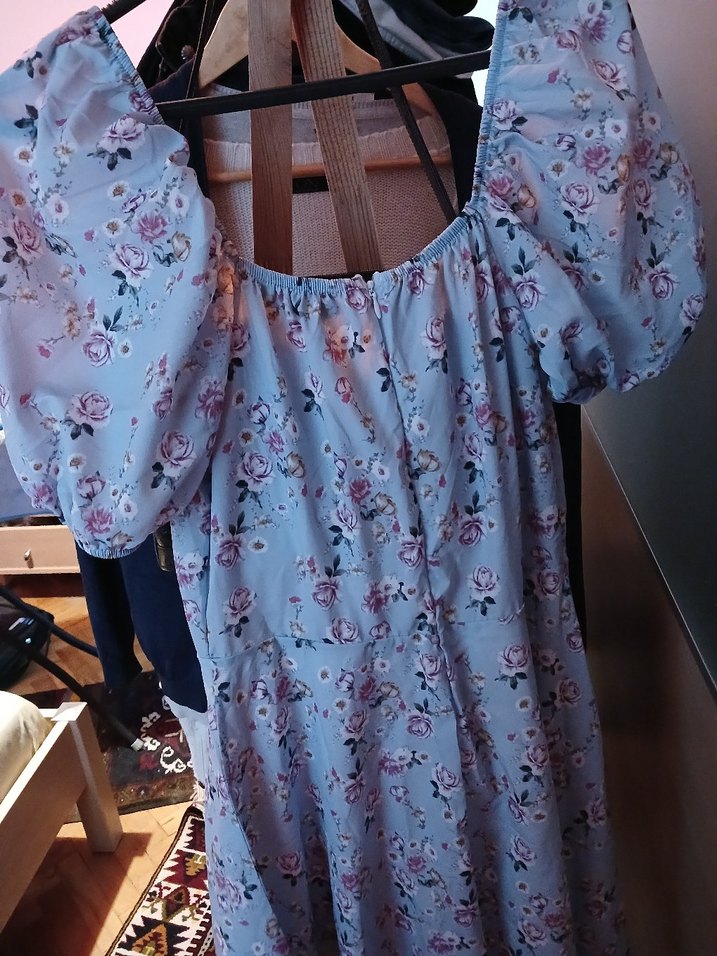 Yumuşak sentetik kumaştan, bol kesim midi elbise. Çiçek desenli, drapeli ve askısız yakalı, bohem tarzda.