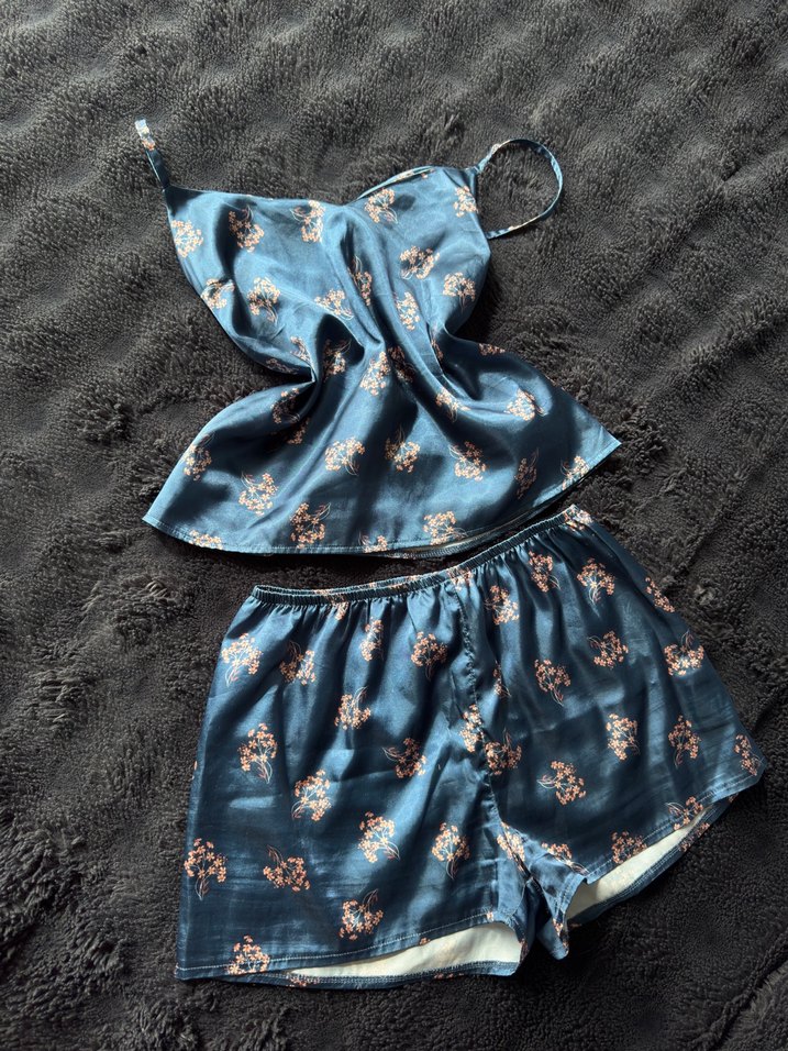 Kadınlar için mavi renkli, gevşek kesim, ip askılı mini üst ve şortlardan oluşan bağlamalı desenli pijama takımı, rahat ve bohem tarzda. 1-2 yerde tırnak takılmasından dolayı deforme var fotoğrafta belirttim 2 kere giydim sadece