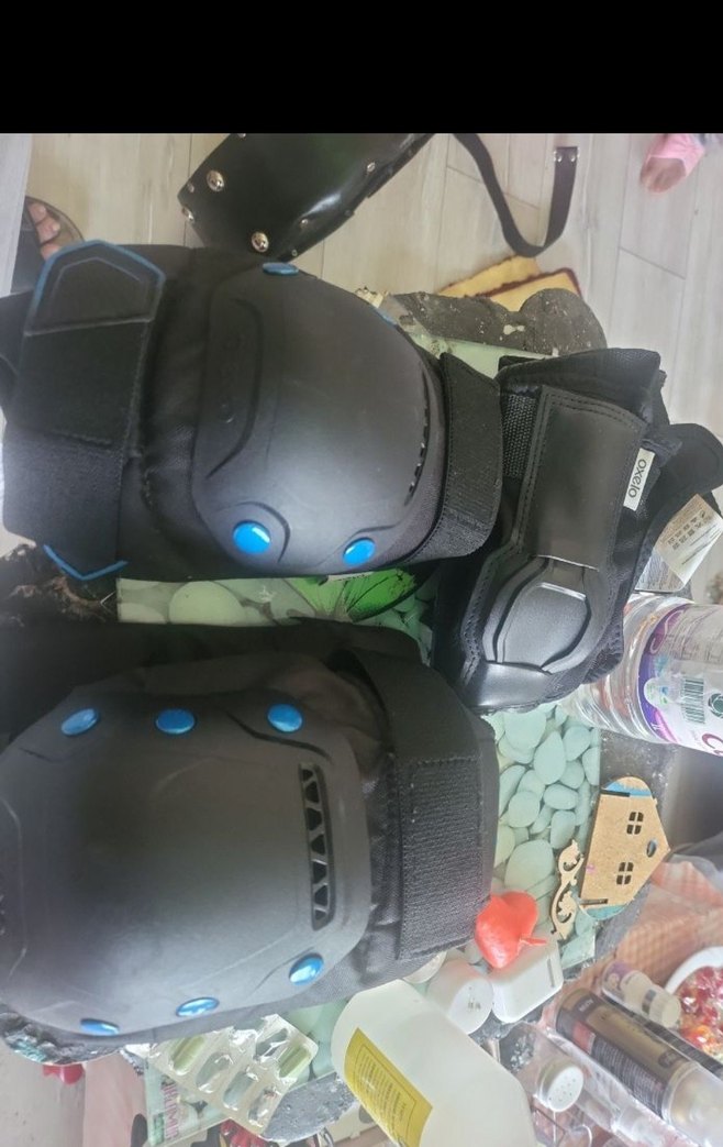 Mavi detaylı, desenli motosiklet dizlikleri, koyu plastikten üretilmiş ve cırt cırtlı bantlarla sabitlenir. Sokak stiline uygun tasarım.