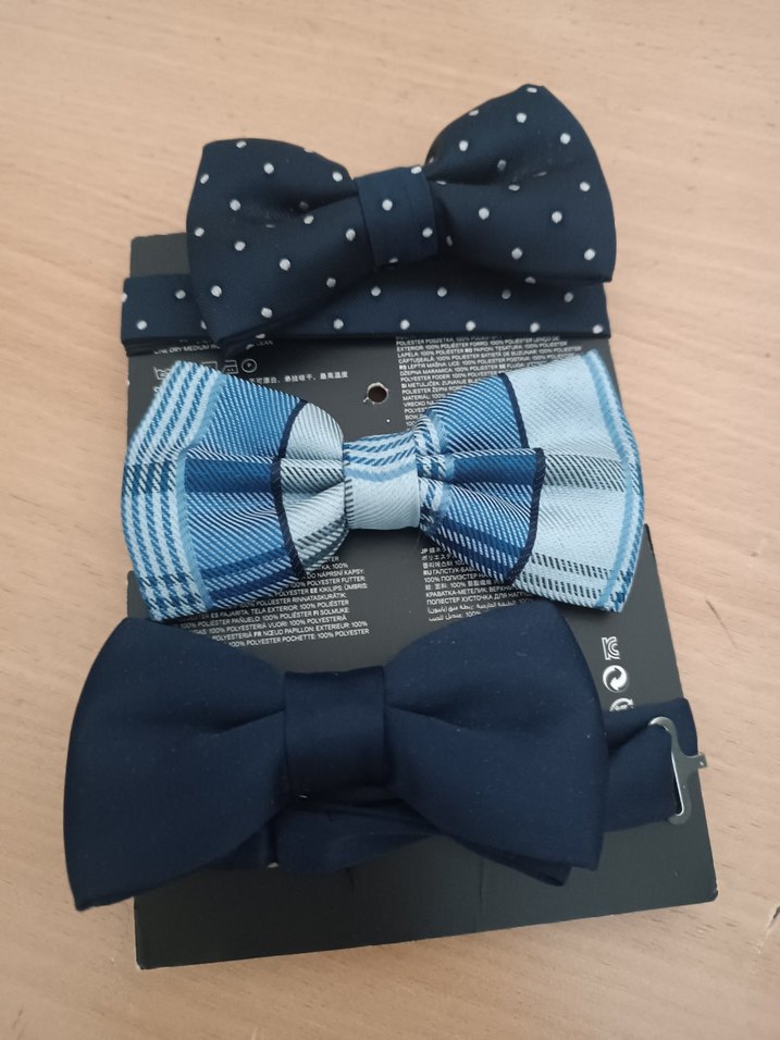 Yumuşak sentetik kumaştan yapılmış, farklı desen ve tarzlarda üç mavi papyon seti, moda