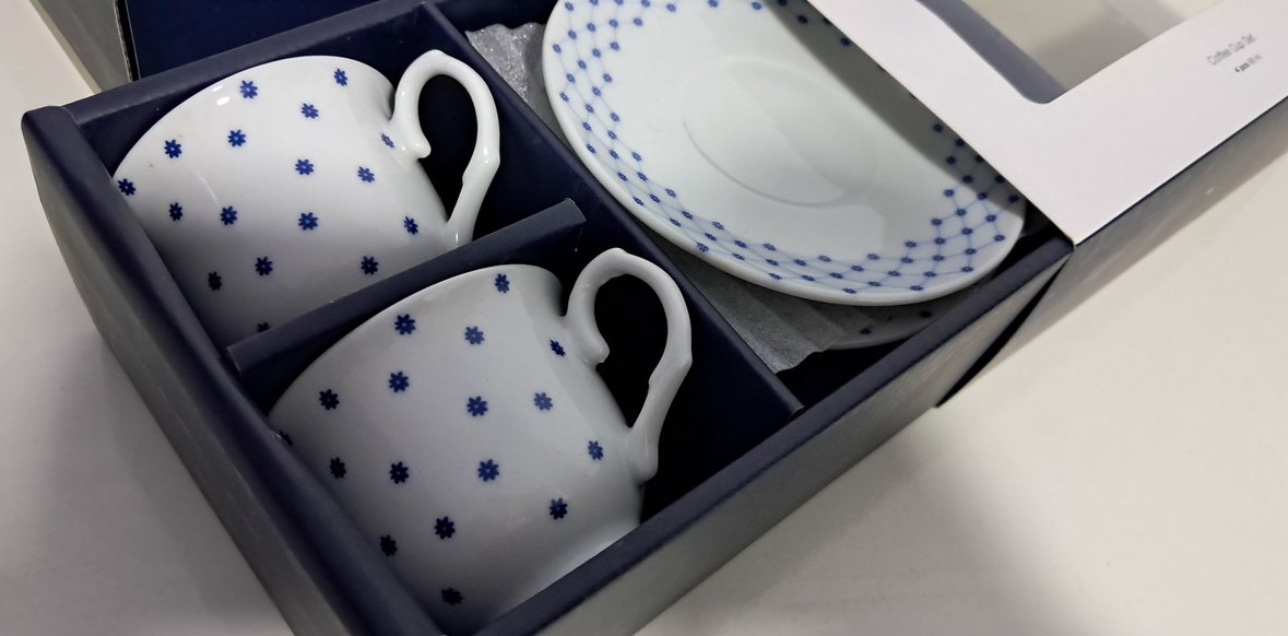 Beyaz taban üzerinde mavi çiçek desenleri bulunan porselen fincan seti. 2 Kişilik 2 adet fincan Seti elimde mevcuttur. (Not: Sadece tek ikili takım isteyene tanesi 375 TL'dir.)