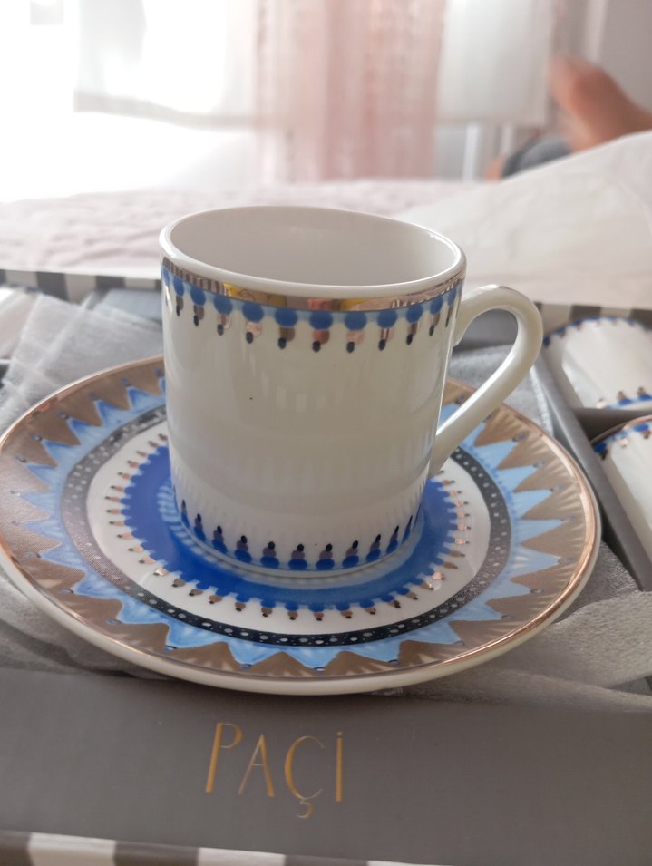 Pastel mavi desenli, gümüş detaylı porselen fincan ve tabağı PACI markalıdır. ☕