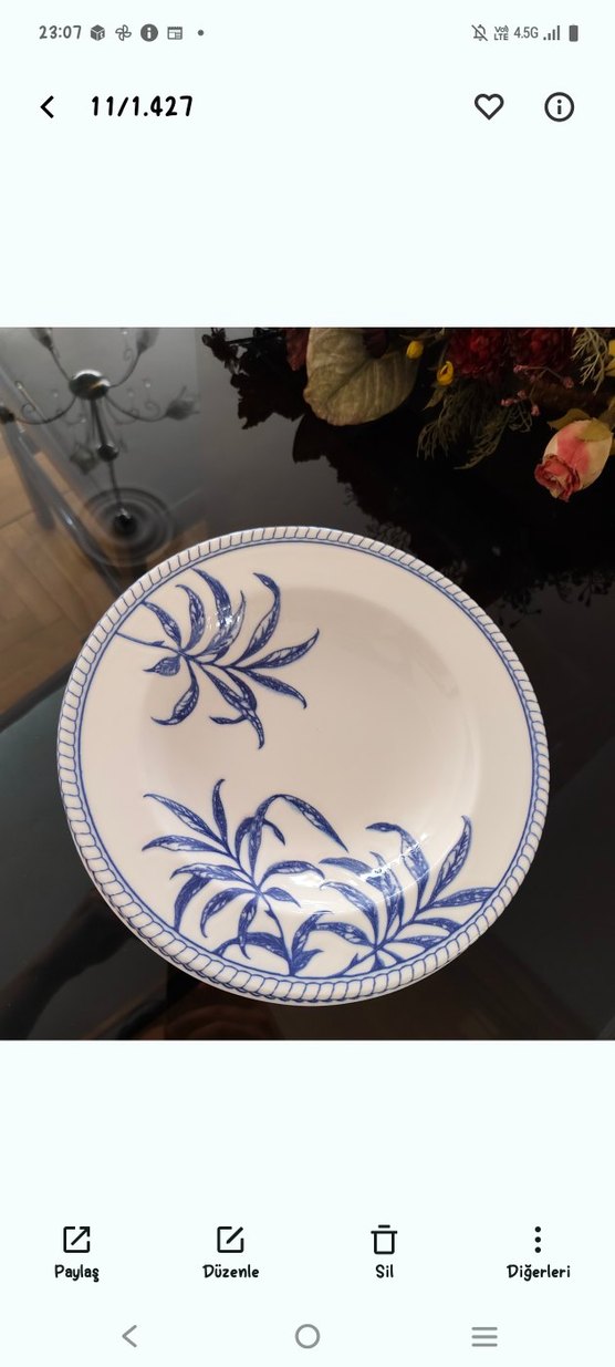 23 cm çapinda koyu mavi çiçek desenli, desenli kenarlara sahip seramik tabak. Yemek servisinde şık bir dokunuş sağlar. ️6 adet